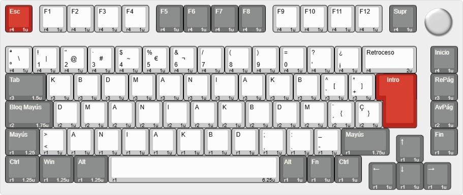 Te presentamos el layout para este modelo tanto en ISO como en ANSI. Podrás comprobar la compatibilidad con nuestros sets de keycaps o con cualquier otro del mercado.  Si buscas otro modelo puedes solicitarlo en nuestra lista de propuestas o por mensaje en cualquier red social.
