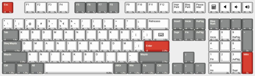 Solamente tener en cuenta las 3 keycaps extras de la última fila tienen opción de poner los iconos extras que incorpora el set o bien otras funciones de R4 como  «Bloq Desp» – «Impr. Pant» etc.  remapeando las teclas.