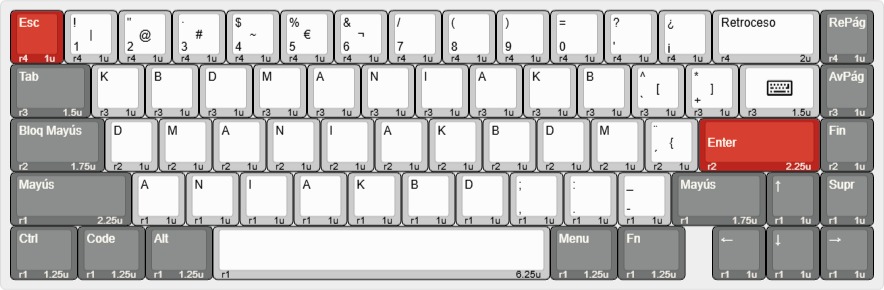 Te presentamos el layout para este modelo tanto en ISO como en ANSI. Podrás comprobar la compatibilidad con nuestros sets de keycaps o con cualquier otro del mercado.  Si buscas otro modelo puedes solicitarlo en nuestra lista de propuestas o por mensaje en cualquier red social.