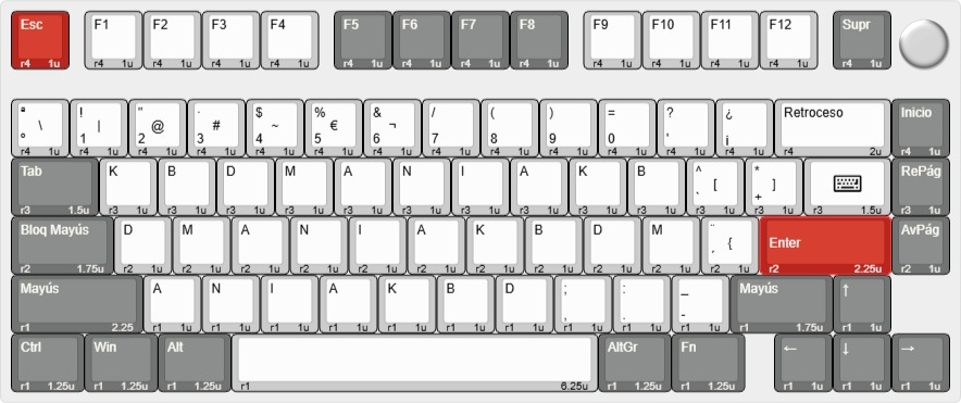 Te presentamos el layout para este modelo tanto en ISO como en ANSI. Podrás comprobar la compatibilidad con nuestros sets de keycaps o con cualquier otro del mercado.  Si buscas otro modelo puedes solicitarlo en nuestra lista de propuestas o por mensaje en cualquier red social.