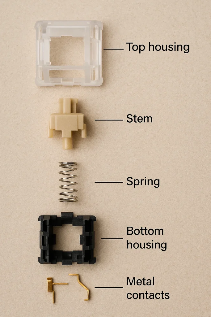 Un switch de un teclado mecánico está compuesto por varias piezas clave que determinan su funcionamiento,sensación y sonido.