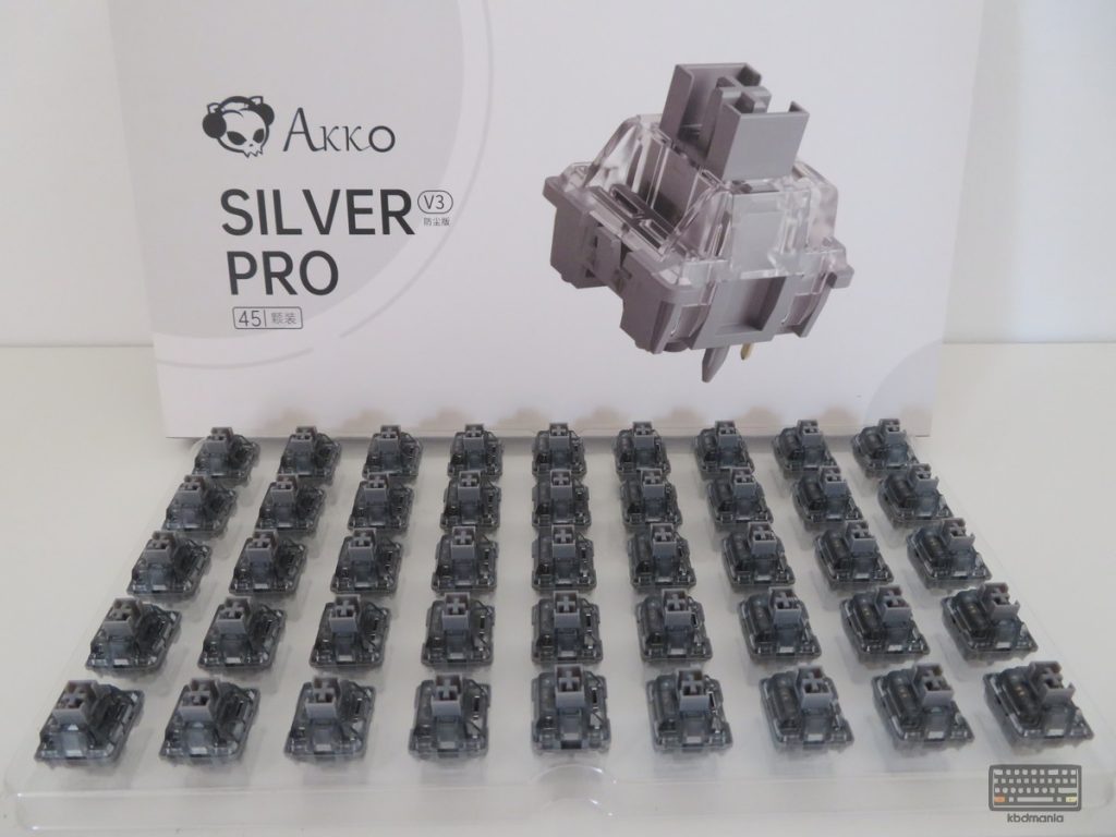 Switches Akko V3 Silver Pro: lineales de actuación ligera (40 ± 5 gf), pre-recorrido ultracorto de 1,0 ± 0,5 mm y recorrido total de 3,3 mm; montura de 5 pines con estructura antipolvo y compatibilidad SMD-LED para tu iluminación RGB