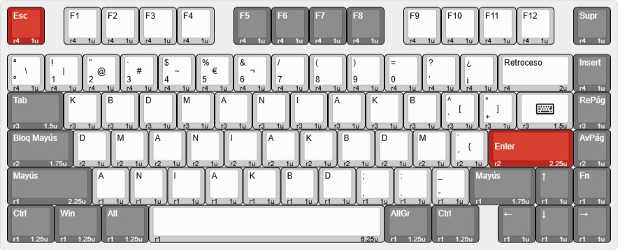 Te presentamos el layout para este modelo tanto en ISO como en ANSI. Podrás comprobar la compatibilidad con nuestros sets de keycaps o con cualquier otro del mercado.  Si buscas otro modelo puedes solicitarlo en nuestra lista de propuestas o por mensaje en cualquier red social.
